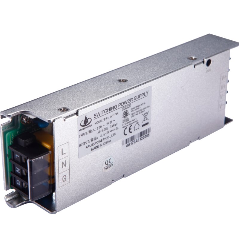 AP179A is a power supply with a wide input voltage range, 85V-265Vac input, DC output 200W Max., voltage regulation function, high current output, and overload protection. The power supply has output short circuit protection, output overcurrent protection, output overvoltage protection, and overtemperature protection. The entire power supply is strictly designed in accordance with safety regulations and meets the safety standards for information technology equipment. The product design meets ETL and TUV-CE certification requirements.